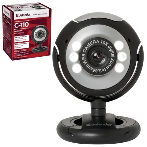 Веб-камера DEFENDER C-110, 0,3 Мп, микрофон, USB 2.0/1.1+3.5 мм jack, подсветка, регулируемое крепление, черная
