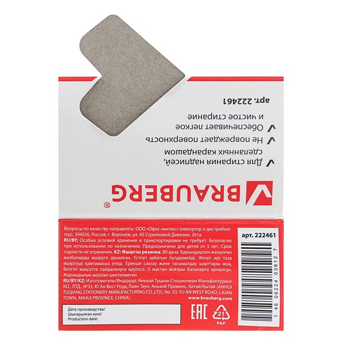 Стирательная резинка для удаления надписей, сделанных карандашом. Обеспечивает лёгкое и чистое стирание без повреждения поверхности бумаги и без образования бумажной пыли.