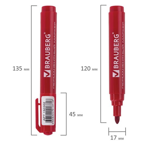 Маркер перманентный BRAUBERG "Classic", круглый наконечник 3 мм, красный
