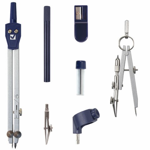 Металлическая готовальня предназначена для учеников старших классов и студентов. В состав входят 7 предметов: циркуль 140 мм, кронциркуль с рейсфедером, рейсфедерная вставка, держатель для карандаша, точилка, пенал с запасным грифелем.