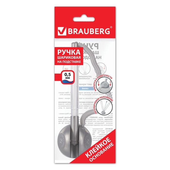 Ручка шариковая настольная BRAUBERG "СТЕНД-ПЕН", на пружинке, с клейким основанием, корпус серебристый, синяя, 142164
