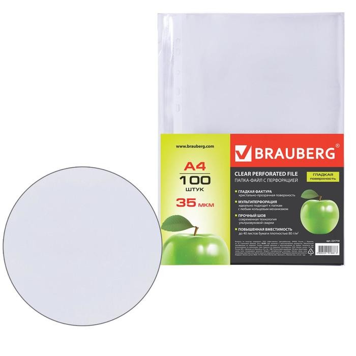 Папки-файлы BRAUBERG, А4, 35 мкм, прозрачный глянцевый, комплект 100 штук