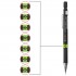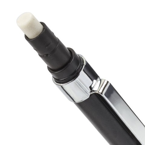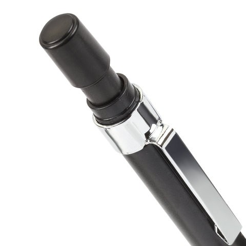 Карандаш с нажимным механизмом. Корпус оснащен передвижным колечком, позволяющим обозначить твердость грифеля внутри. Хромированные детали. Цанга убирается внутрь корпуса. Карандаш заправлен грифелем и оснащен ластиком.