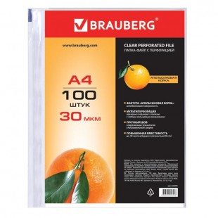 Прозрачная перфорированная папка-файл BRAUBERG совместима с любыми видами архивных папок. Антибликовая поверхность «апельсиновая корка» позволяет копировать документы, не вынимая их из папки.