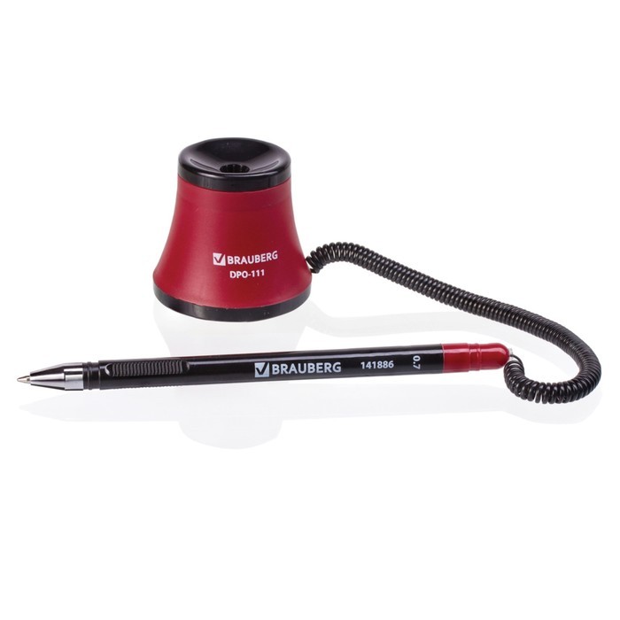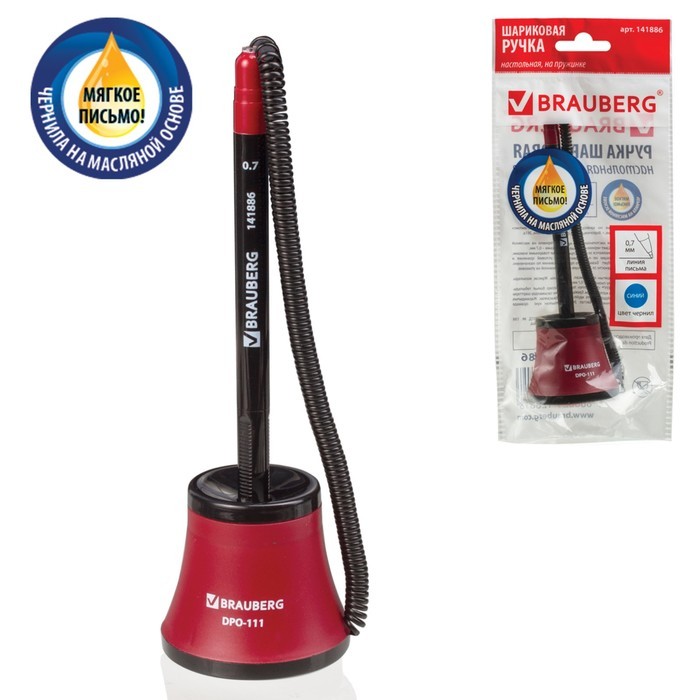 Ручка шариковая настольная BRAUBERG "СТЕНД-ПЕН N1", масляная основа, на пружинке, корпус черный/красный, синяя, 141886