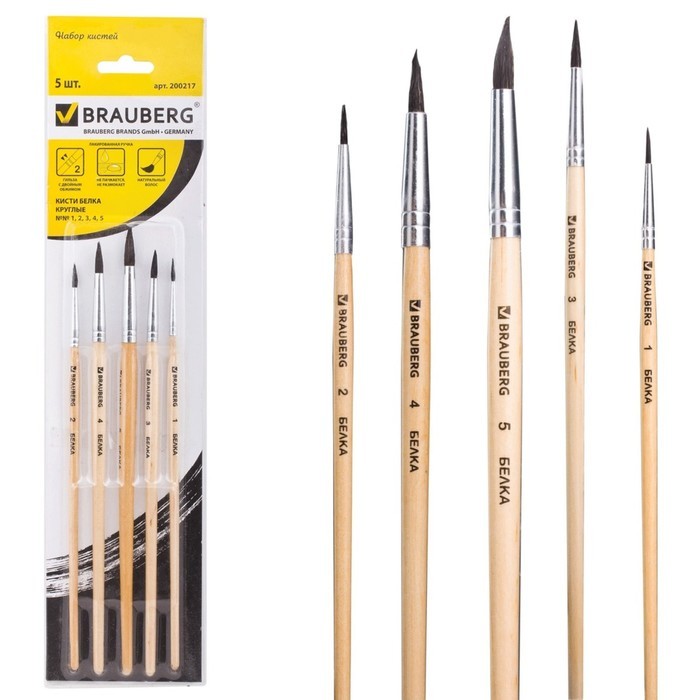 Кисти BRAUBERG, круглые, № 1, 2, 3, 4, 5, беличья, набор 5 штук