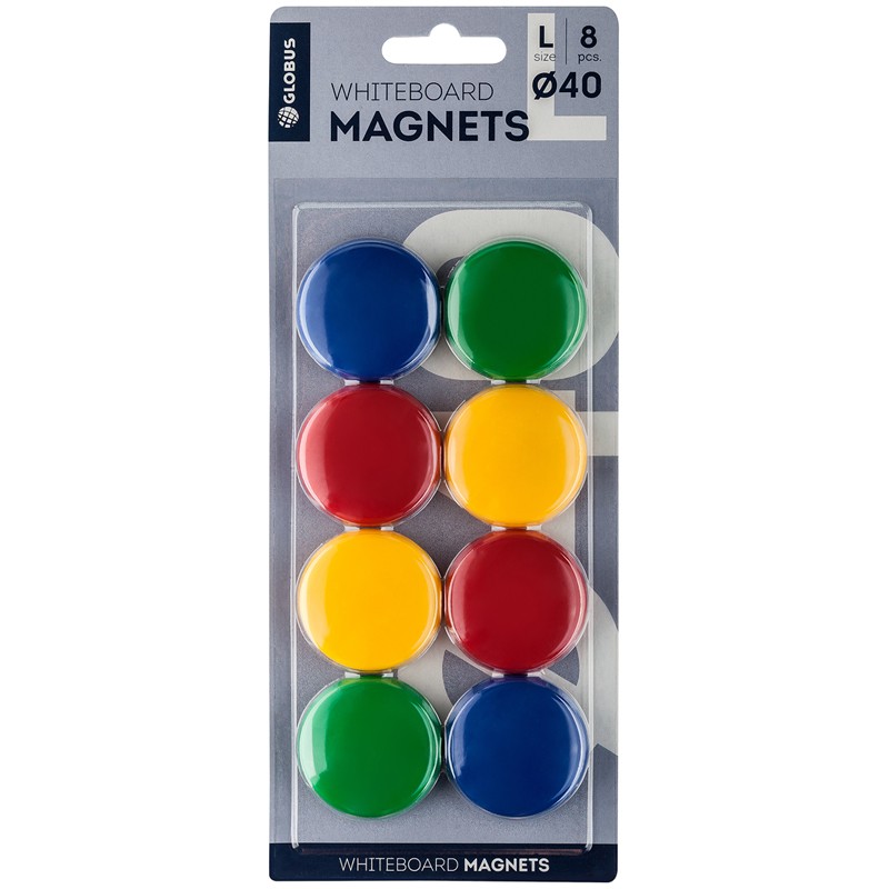 Набор цветных магнитов. Размер — 40 мм. Надежно удерживаются на любой железной или стальной поверхности. Упаковка — блистер с европодвесом. В упаковке 8 штук