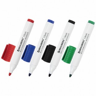 Описание Набор маркеров BRAUBERG "CLASSIC" предназначен для использования на белых досках с магнитно-маркерной поверхностью. Идеально подходит для проведения презентаций, совещаний, уроков. 4 цвета в наборе: черный, красный, синий, зеленый. Круглый пластиковый корпус имеет диаметр 15 мм. Наконечник круглой формы обеспечивает толщину линии письма 3 мм, что позволяет писать крупным шрифтом, который будет хорошо виден. Основа чернил - спиртовая. Чернила быстро высыхают и не оставляют разводов, легко стираются сухой губкой. Изделие не перезаправляется. Цвет колпачка и клипа соответствует цвету чернил.