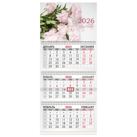 Календарь квартальный 2026 BRAUBERG, "Пионы" 3 блока, 295х682 мм