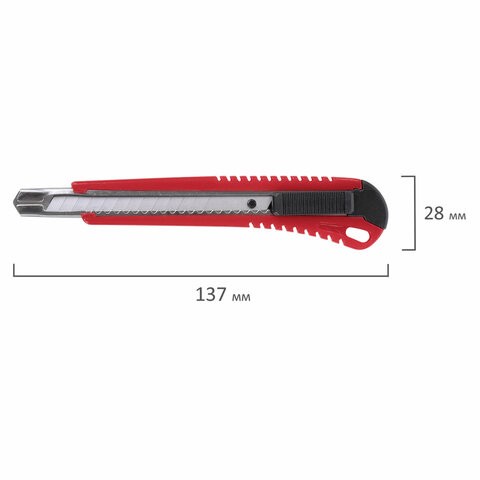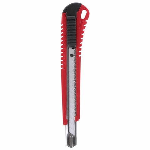 Канцелярский нож STAFF "PRO" — универсальный, удобный и простой инструмент, который применяется во многих сферах: на складе, в офисе, строительстве, производстве, творчестве и дома. Предназначен для резки различных материалов разной плотности и толщины. Благодаря своей обтекаемой форме нож удобно держать в руке. Пластиковый корпус гарантирует безопасность применения. Автофиксатор позволяет закрепить лезвие в нужном положении с помощью защелки. Для того, чтобы хранить и переносить инструмент было проще, в корпусе имеется небольшое отверстие. Нож усиленный с металлическими направляющими, которые надежно удерживают лезвие шириной 9 мм и позволяют выдерживать большую нагрузку. Чтобы восстановить функциональность инструмента из-за затупившегося лезвия, необходимо обломать его по наклонной метке на поверхности лезвия. При этом его нужно выдвинуть только на одно деление. В щель на снятой крышке необходимо поместить затупившийся край лезвия ножа.