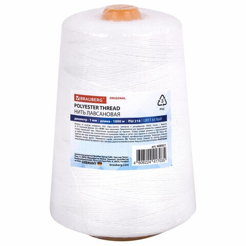 Описание Лавсановая нить BRAUBERG ORIGINAL применяется для прошивки и брошюровки документов в банках и офисах. Подходит для всех типов ручных мешкозашивочных машинок. Нить диаметром 1 мм, скрученная из четырех высокопрочных полиэфирных нитей, намотана на конусную пластиковую бобину. Изготовлена из полиэфирного (лавсанового) волокна белого цвета. Мало подвержена воздействию ультрафиолетовых лучей. Не боится холода и сырости. Универсальная, имеет широкий спектр применения: от прошивки документов до пошива упаковочной тары и различных изделий. Подходит для ручных и стационарных швейных машин. Вес бобины с нитью – в среднем 0,215 кг. Длина намотки – 1000 м. Разрывная нагрузка – 6,5 кгс. Линейная плотность (ЛШ) – 210 текс.
